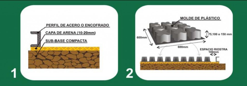 Estas bandejas para la realización del pavimento «Céspedarmado Paviprint®» se colocan sobre una sub-base, lo mejor compactada posible sobre la que se extenderá una capa de 10/20 mm. de arena. Los bordes perimetrales se encofrarán, dejando un ancho entre este y el molde de 100 mm. para formar una riostra perimetral de hormigón. Para armar el pavimento se usarán mallas electrosoldadas de refuerzo según UNE 36.092/81 con cuadrícula de 20 x 20 cm. y el hormigón será de R(fck) = 250 Kg/cm2 y árido de 10/12 mm. Una vez extendido el hormigón al día siguiente se podrá quemar la parte vista de los moldes y rellenarla con tierra de calidad adecuada. Después de que esta primera tierra asiente, se podrá rellenar con otra más fina y de mejor calidad, para después sembrar con la semilla adecuada.