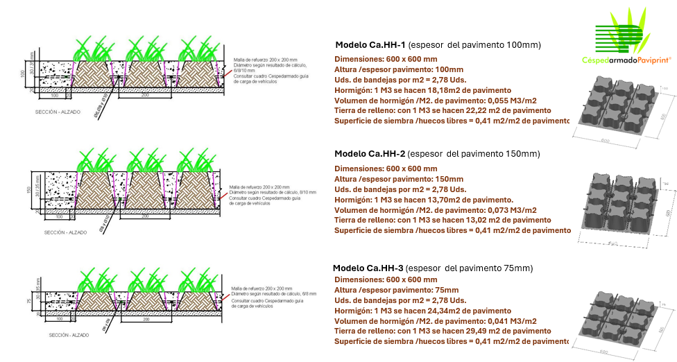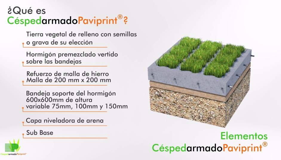 Céspedarmado Paviprint es un sistema de hormigón reforzado celular en masa con cavidades que se crean al modelar el hormigón sobre moldes de plástico vacíos. El pavimento continuo hierba-hormigón es un sistema de construcción in situ para producir una superficie con la apariencia general de hierba natural con la capacidad de carga y duración del hormigón armado, en base al vertido y extendido de hormigón y su refuerzo armado, sobre unas bandejas de plástico, fabricadas utilizando materiales reciclados, de medidas 600×600 mm. Los moldes de plástico, fabricados utilizando materiales reciclados, son el fruto de largos años de estudio durante los cuales se ha ido perfeccionando la forma de la cavidad y la naturaleza y el revenido del proceso de formación del vacío. Una de sus prestaciones clave consiste en que a pesar de ser lo bastante resistentes para soportar cargas variables de hormigón, los moldes son tan finos que resulta muy sencillo derretir su parte superior para dejar libre las cavidades.