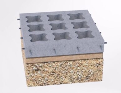 Pavimento continuo hierba-hormigón Céspedarmado Paviprint. El procedimiento de ejecución se basa en el empleo de unas bandejas de plástico, fabricados utilizando materiales reciclados, de medidas 600×600 mm.