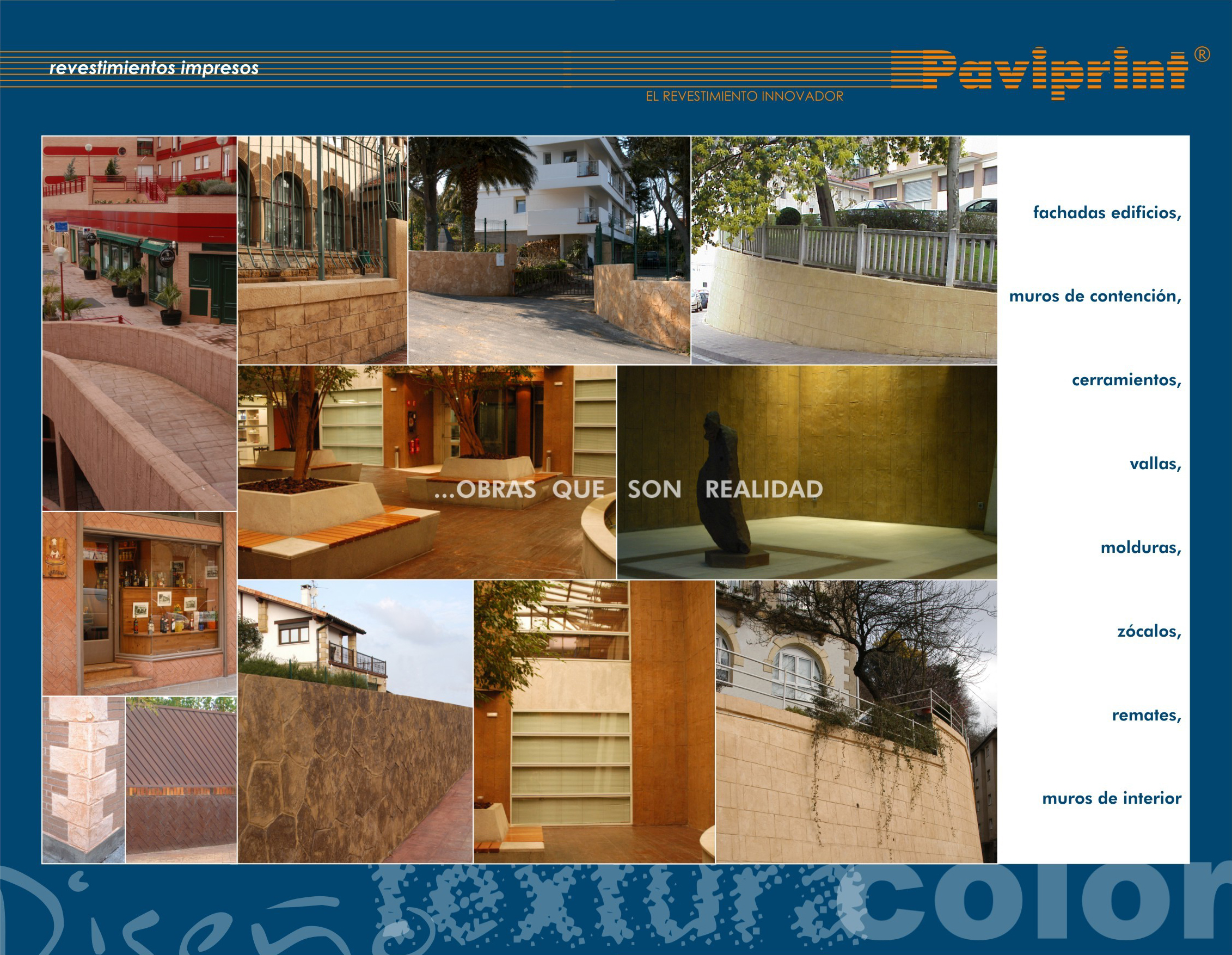 Los avances en los acabados de los paramentos verticales han dado lugar a técnicas como la creada con los morteros especialmente formulados por PAVIPRINT® para poder revestir y texturizar todas estas superficies de una forma cómoda y sencilla; a la vez que proporcionando al técnico o persona que diseñe, los colores y formas que necesiten para su perfecto acabado. PAVIPRINT® la ofrece más de cincuenta diseños de moldes, con diferentes texturas, y con la posibilidad de mezclar y diseñar a su gusto. Los morteros utilizados para el revestimiento PAVIPRINT® son tixotrópicos de granulometría media, aptos para su aplicación sobre soportes de hormigón, bloques de hormigón, fábrica de ladrillo cerámico; no deben ser usados sobre soportes hidrofugados superficialmente, de yeso, ni sobre pinturas o revestimientos plásticos. Estos morteros adquieren unas excelentes resistencias mecánicas y un buen curado interno, pudiéndose emplear tanto para obras realizadas en exteriores – muros, fachadas, etc. – como en interiores – restaurantes, bodegas, interior de viviendas, etc.