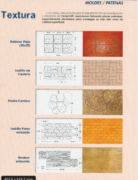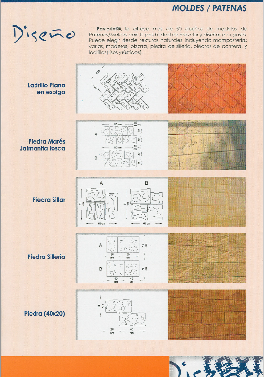 Paviprint, le ofrece más de 50 diseños de modelos de Patenas/Moldes con la posibilidad de mezclar y diseñar a su gusto. Puede elegir desde texturas naturales incluyendo mamposterías varias, maderas, pizarra, piedra de sillería, piedras de cantera, y ladrillos (lisos y rústicos).